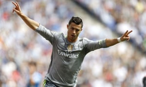 Real Madrid’s Cristiano Ronaldo celebrates his first of five goals against Espanyol. Photograph: Alejandro Garcia/EPA